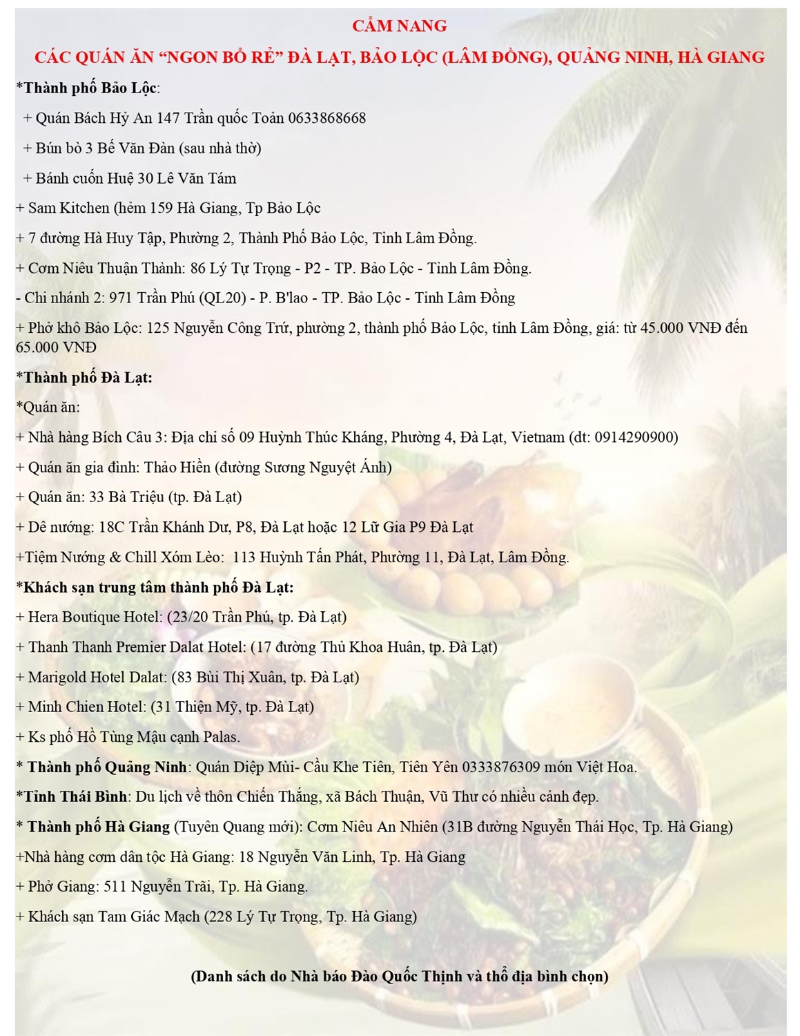 Các quán ăn “ngon bổ rẻ” Đà Lạt, Bảo Lộc (Lâm Đồng), Quảng Ninh, Hà Giang