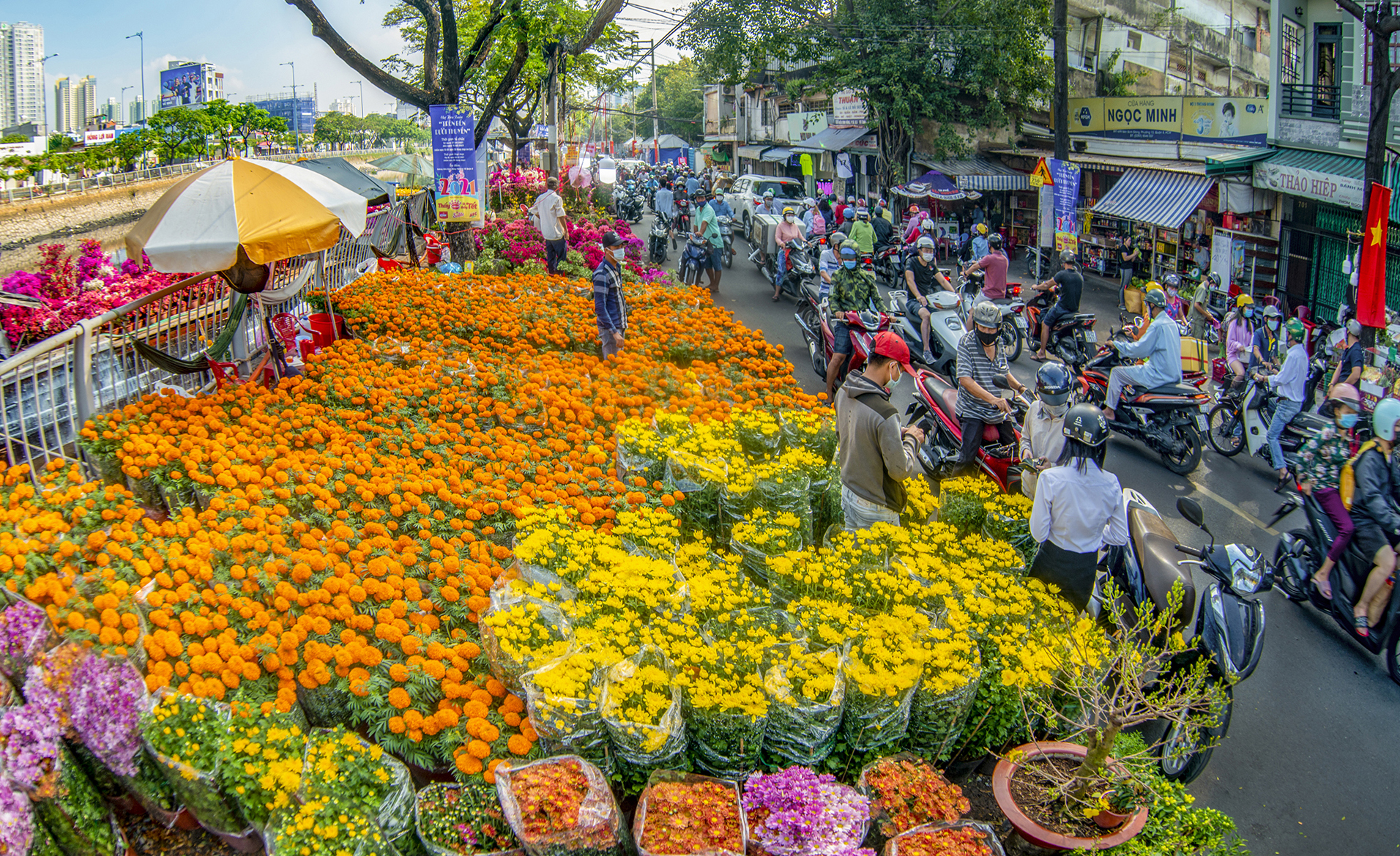 Ấn tượng nhất với tôi là chợ hoa xuân Bến Bình Đông. Hàng trăm ghe thuyền từ các tỉnh miền Tây chở đầy hoa, cây kiểng nối đuôi nhau cập bến. Khung cảnh “trên bến dưới thuyền” gợi lại nét sinh hoạt đặc trưng của vùng sông nước Nam Bộ, nay hiện diện giữa lòng đô thị hiện đại. Từ trên cao nhìn xuống, cả tuyến đường Bình Đông như được phủ kín bởi sắc vàng, sắc đỏ, sắc hồng của mùa xuân.