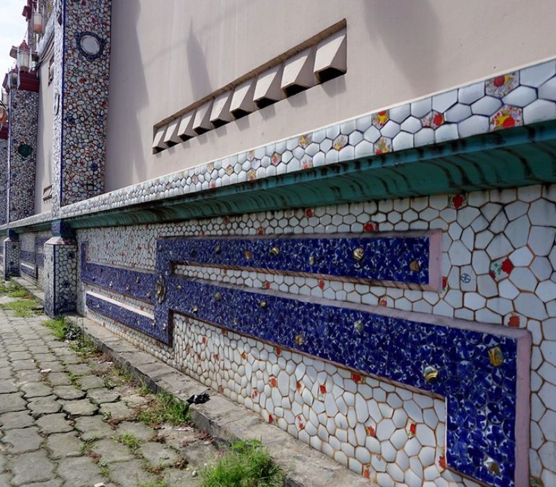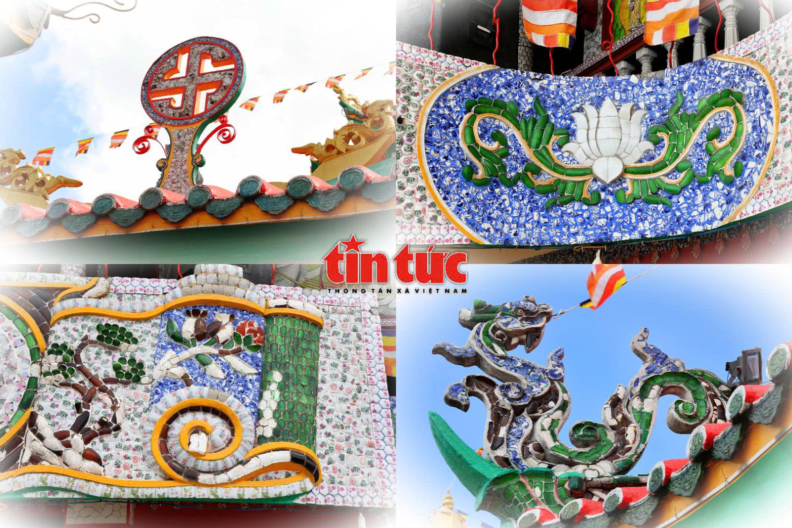 Nhìn từ xa, chùa như một bức tranh rực rỡ sắc màu, với những họa tiết rồng, phượng, hoa sen, cá chép… được đắp nổi sống động và công phu. Mỗi chi tiết đều chứa đựng tâm huyết của các nghệ nhân, thể hiện sự kết hợp hài hòa giữa văn hoá Phật giáo, nghệ thuật trang trí dân gian và tinh thần tiết kiệm, tái chế mang đậm bản sắc Á Đông.