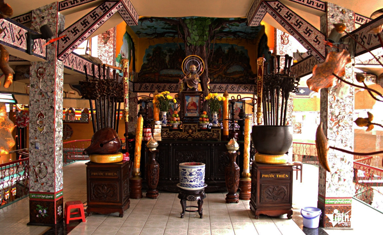 Không gian bên trong chùa càng khiến người ta ngỡ ngàng hơn khi các tượng Phật, bàn thờ, tháp chuông… đều được tô điểm bằng kỹ thuật khảm sành truyền thống – kỹ thuật từng xuất hiện phổ biến trong nghệ thuật cung đình xưa, đặc biệt ở Huế, nhưng nay đã mai một dần.