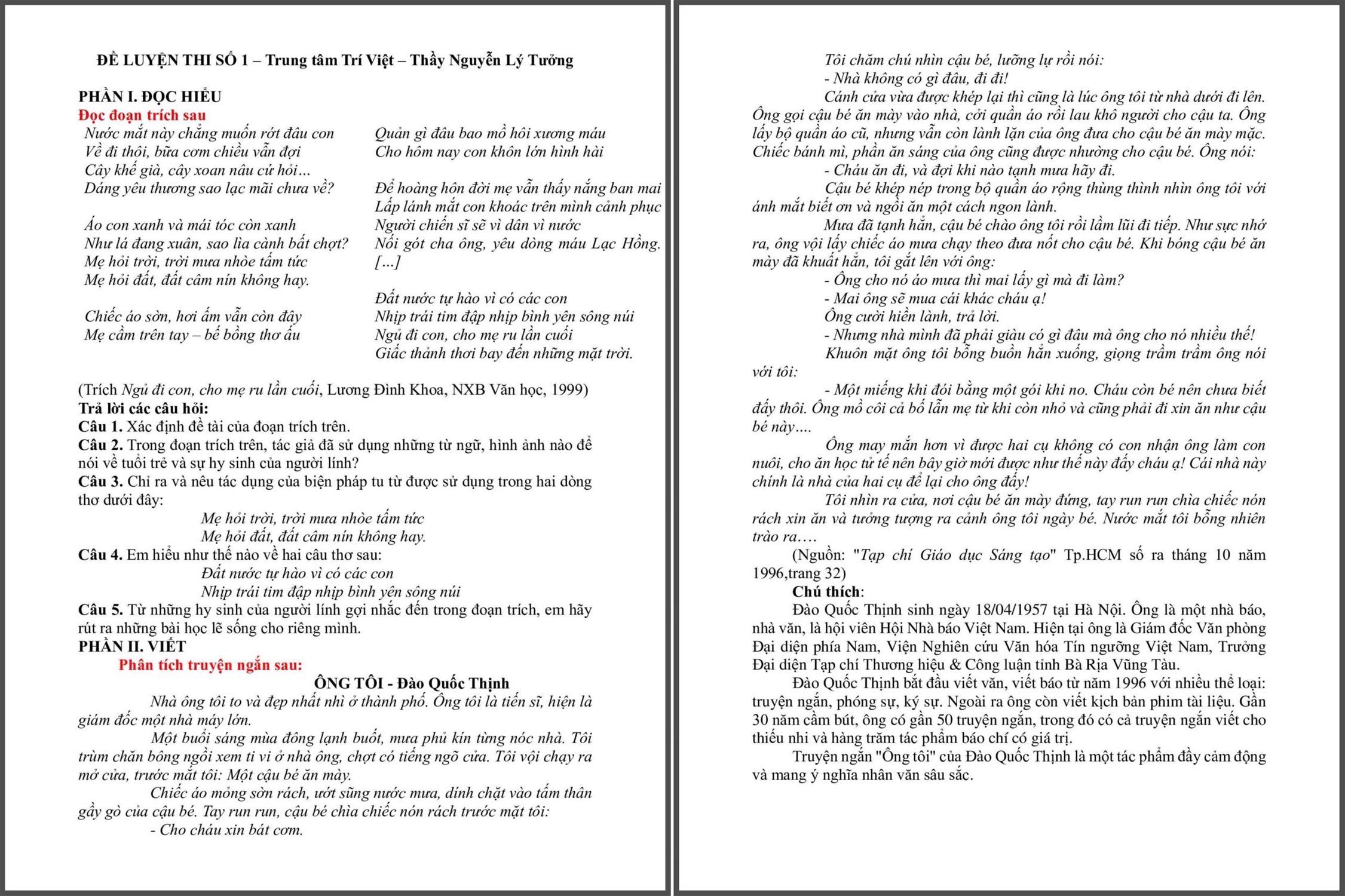 ĐỀ LUYỆN THI SỐ 1 – Trung tâm Trí Việt – Thầy Nguyễn Lý Tưởng