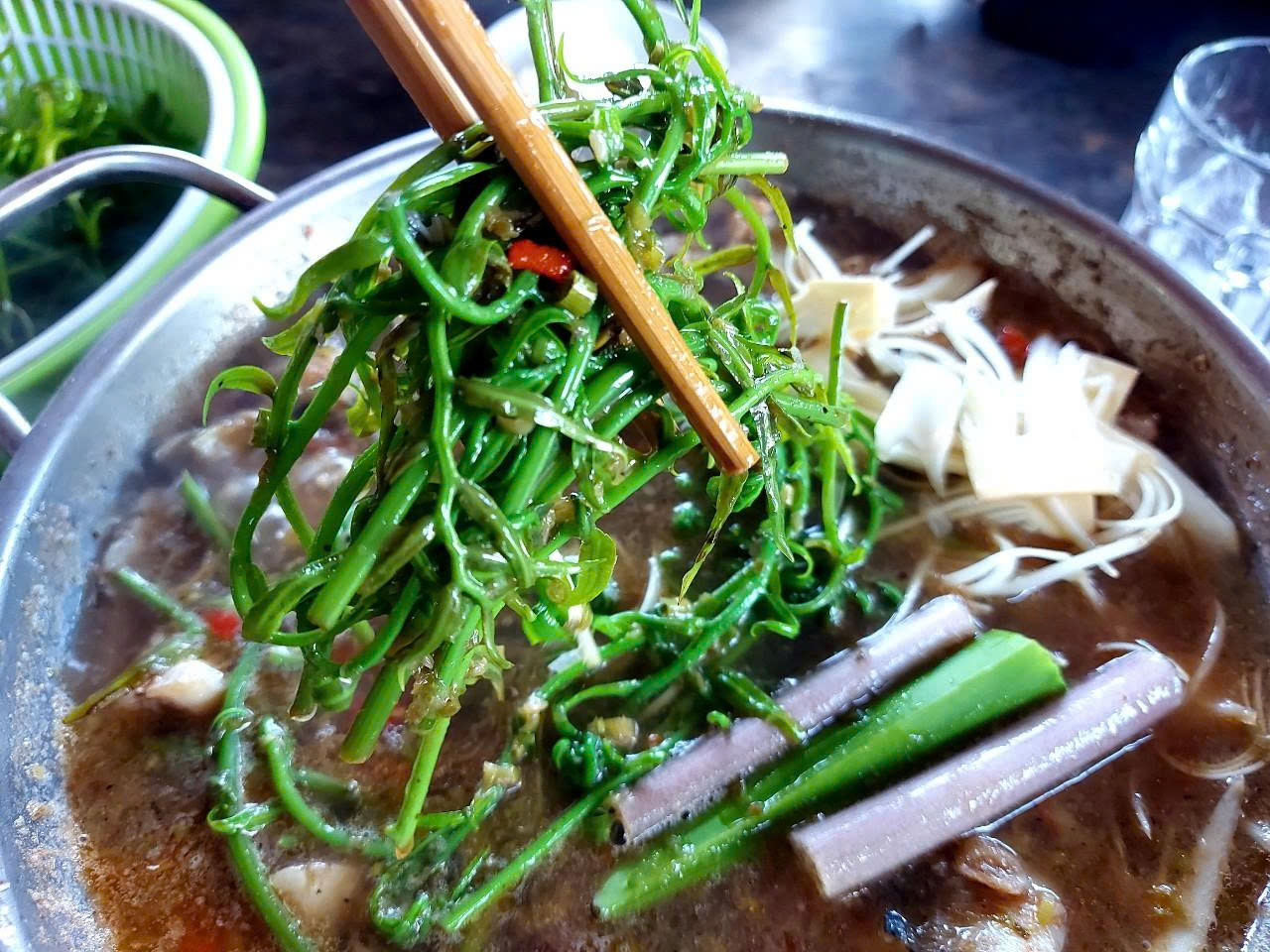 Đọt choại nhúng lẩu mắm cá đồng là món ăn quen thuộc của người miền Tây.