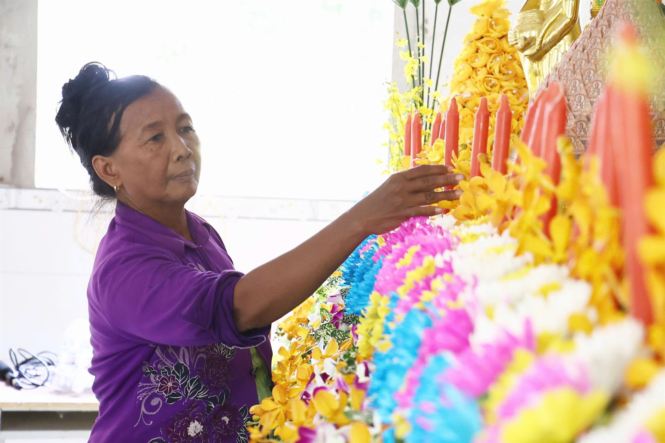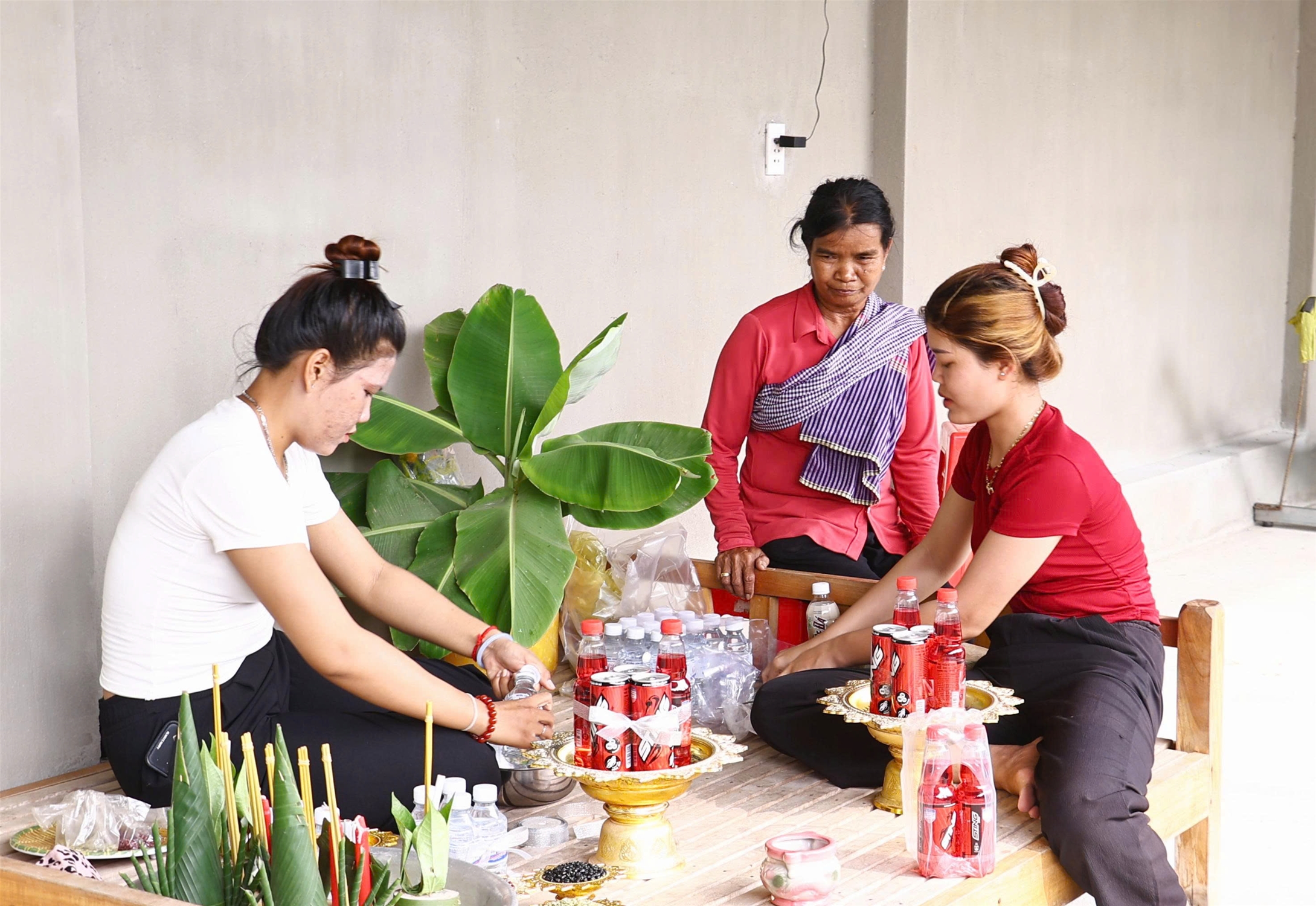Gia đình chị luôn chú trọng việc chuẩn bị bàn cỗ theo truyền thống của dân tộc mình. Bàn cỗ được chuẩn bị đầy đủ các loại vật phẩm: 5 nhánh hoa, 5 cây nến, 5 cây nhang, ngũ cốc và nhiều loại hoa quả. Đặc biệt, năm nay, gia đình chị còn nhờ sư ở chùa về hướng dẫn làm bộ vật phẩm tế lễ Bai Sey để dâng lên các vị thần, tổ tiên. Bai Sey là tháp lễ vật hình chóp nón, tượng trưng cho núi Meru thiêng liêng, thể hiện sự kính trọng với đức Phật, thần linh và tổ tiên. Trong các dịp lễ như Chol Chnam Thmay hay Sen Dolta, Bai Sey tượng trưng cho sự kết nối tâm linh, cầu mong mưa thuận gió hòa, mùa màng bội thu và sự bình an, may mắn cho gia đình.