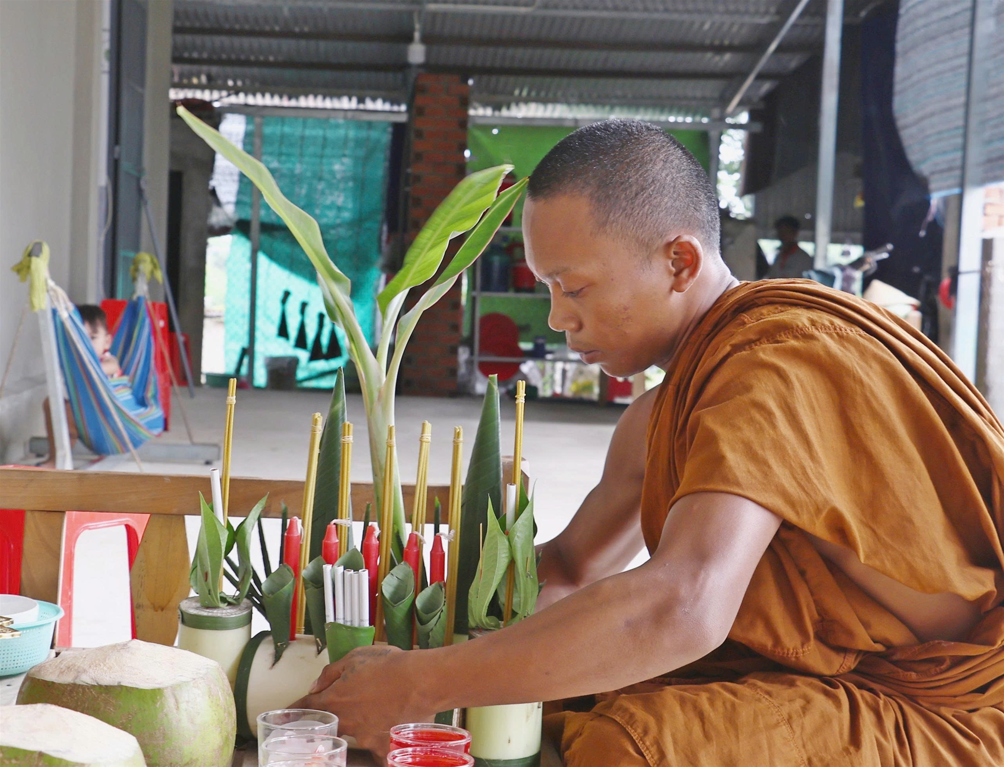 Nhà sư giúp người dân làm bộ vật phẩm tế lễ Bai Sey để dâng lên các vị thần, tổ tiên