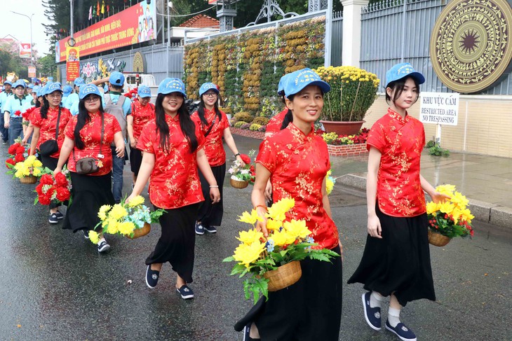 Các đội hình trang phục truyền thống Việt Nam xen kẽ trong lễ hội tạo nên nét giao thoa văn hóa đặc sắc