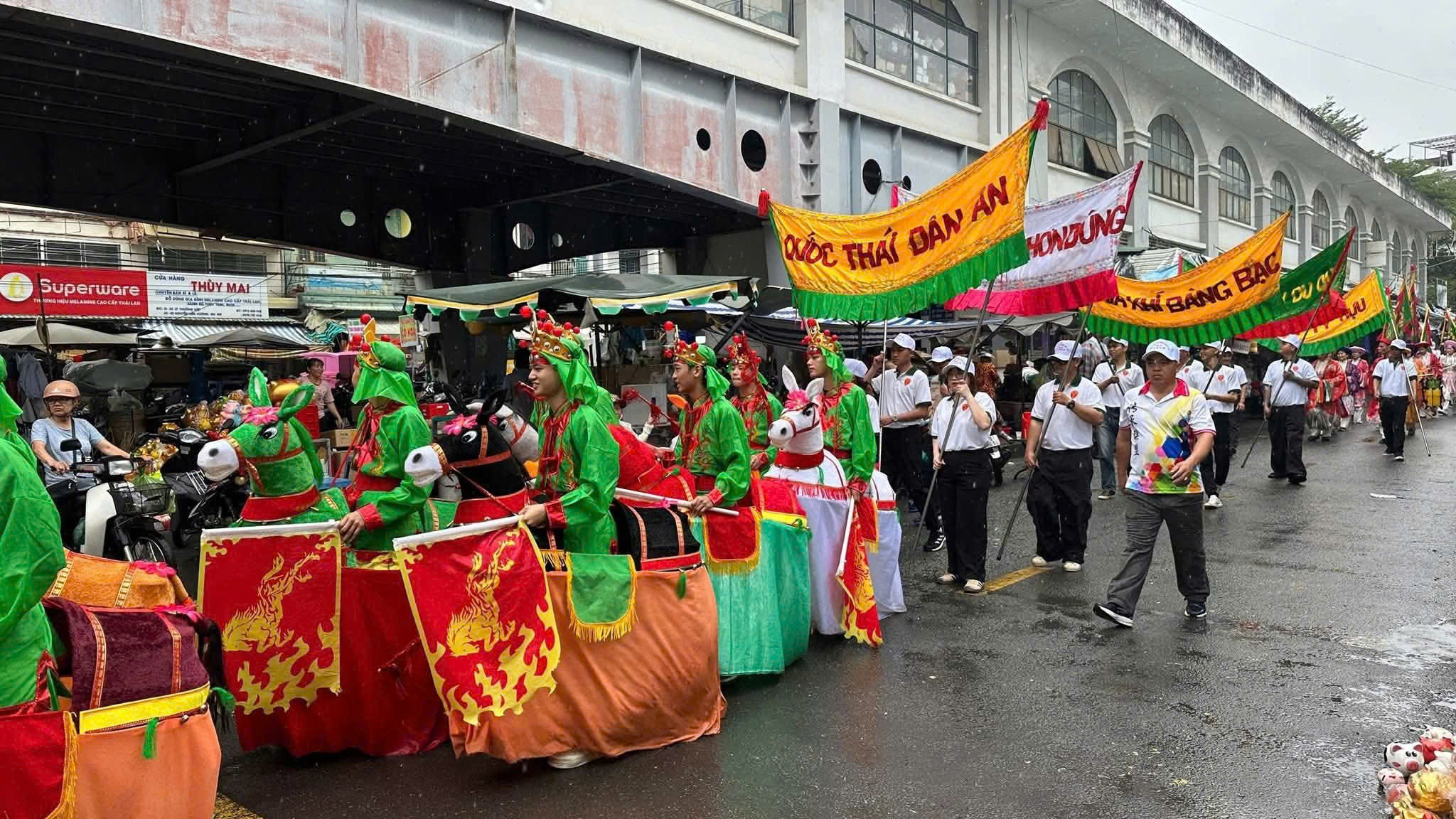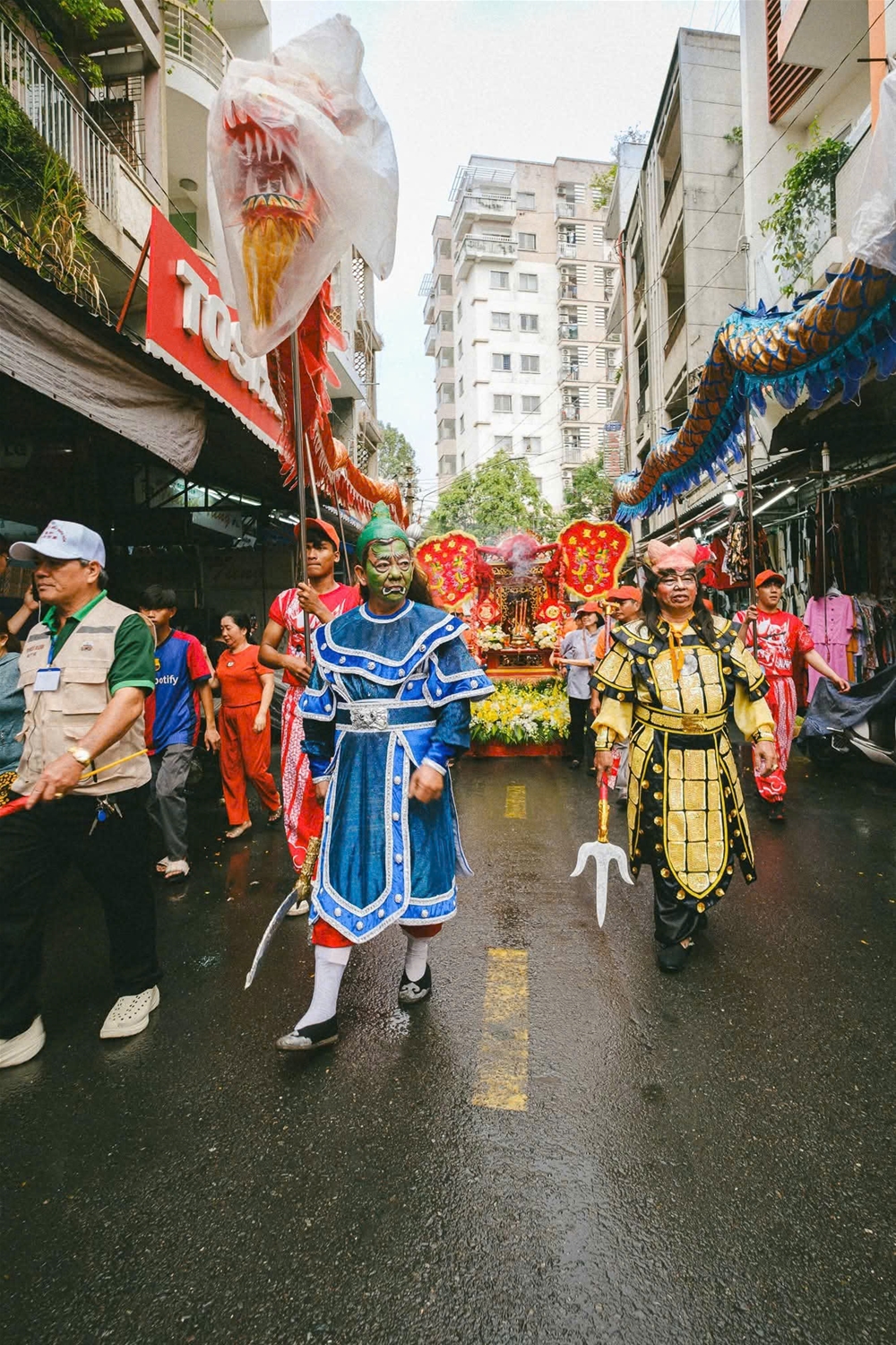 Trên đường bộ, các hội quán người Hoa mang đến nhiều tiết mục múa dân gian đặc sắc. Hình ảnh mô phỏng các vị tướng, nhân vật lịch sử, đội hầu, lân – sư – rồng, cùng âm nhạc cổ truyền Triều Châu, Mân Nam… đã biến các tuyến phố thành một “sân khấu” lễ hội đầy màu sắc, thu hút đông đảo người dân và du khách hòa mình chung vui.