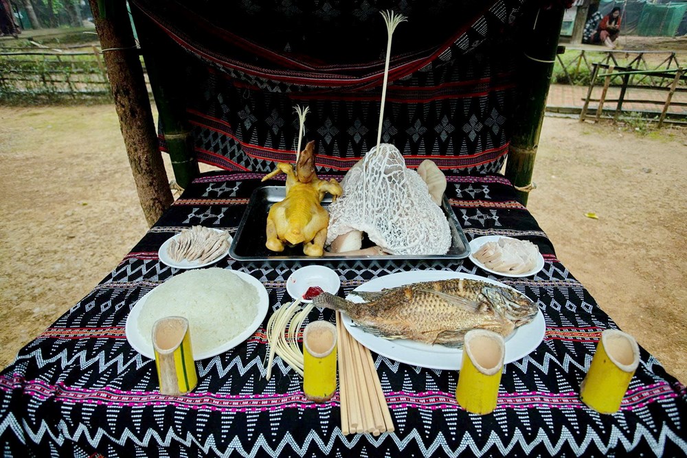 Lễ vật cúng được bày ra mâm và tổ chức cúng tại lều cúng chuẩn bị trước đó. Mâm cúng chuẩn bị đầy đủ tất cả các lễ vật của người Cơ Tu xã Sông Kôn và Đông Giang đã mang theo như đầu heo, gà, cá, xôi, huyết heo, huyết gà, rượu, trà thuốc, đũa thần...