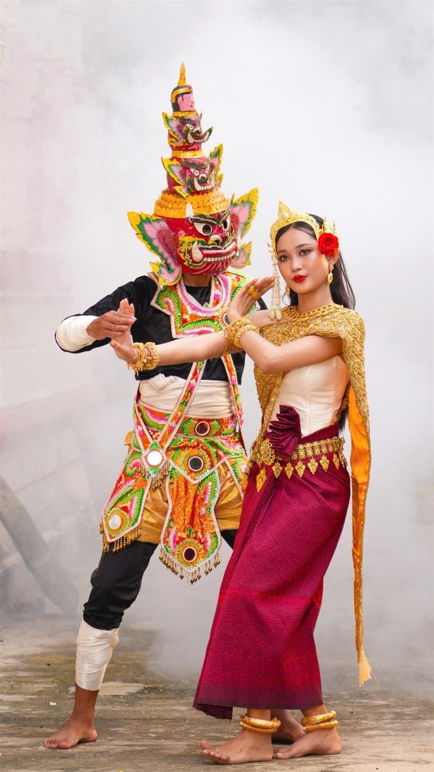 Tạo hình nhân vật Chằn Krông Riêp và nhân vật nữ chính Sita trong múa Chằn của đồng bào Khmer.