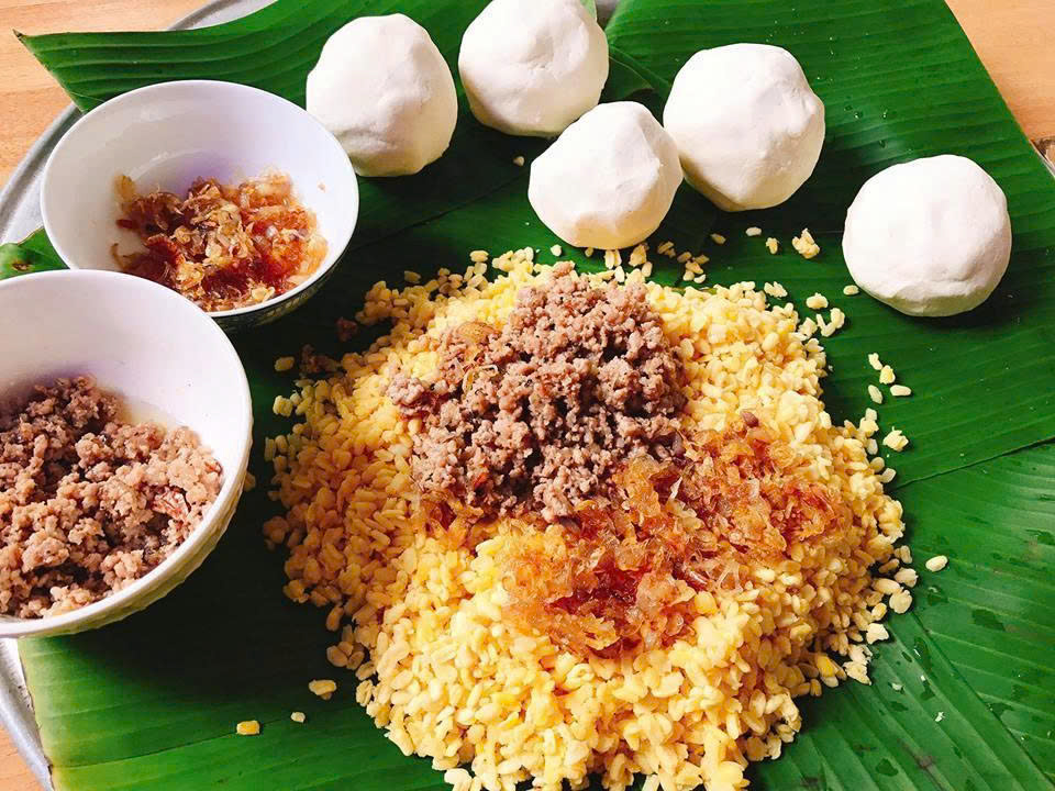 – Làm nhân ngọt bằng đậu xanh đãi sạch, nấu mềm, miết nhuyễn và nắm thành từng viên nhỏ với một chút đường.
