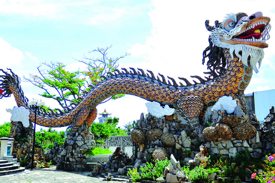 Không gian chùa còn gây ấn tượng với các tiểu cảnh được tạo tác công phu. Bên trái là tượng chim phượng hoàng ghép từ đá tự nhiên, phần đuôi xòe ra tạo thành hốc đá thờ Bồ Tát Quán Thế Âm. Bên phải là hình tượng rồng khổng lồ cẩn miểng sứ lấp lánh, thể hiện tài hoa của nghệ nhân địa phương.