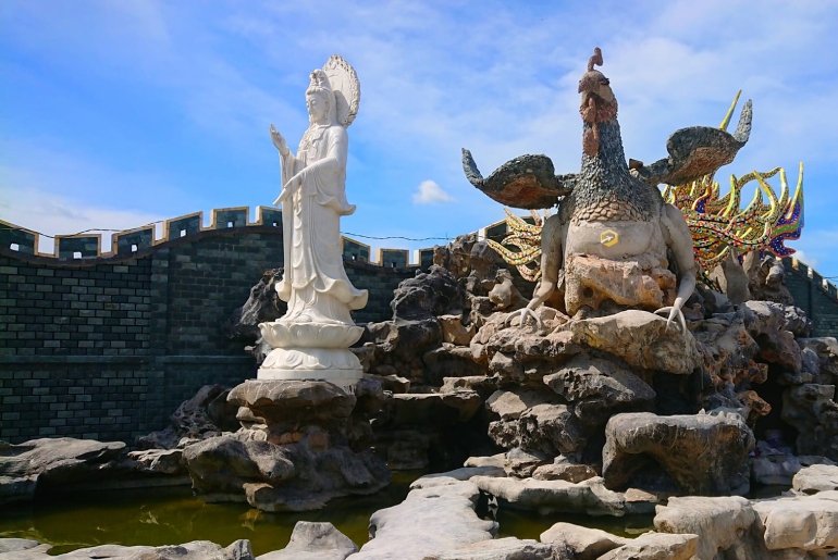 Không gian chùa còn gây ấn tượng với các tiểu cảnh được tạo tác công phu. Bên trái là tượng chim phượng hoàng ghép từ đá tự nhiên, phần đuôi xòe ra tạo thành hốc đá thờ Bồ Tát Quán Thế Âm. Bên phải là hình tượng rồng khổng lồ cẩn miểng sứ lấp lánh, thể hiện tài hoa của nghệ nhân địa phương.
