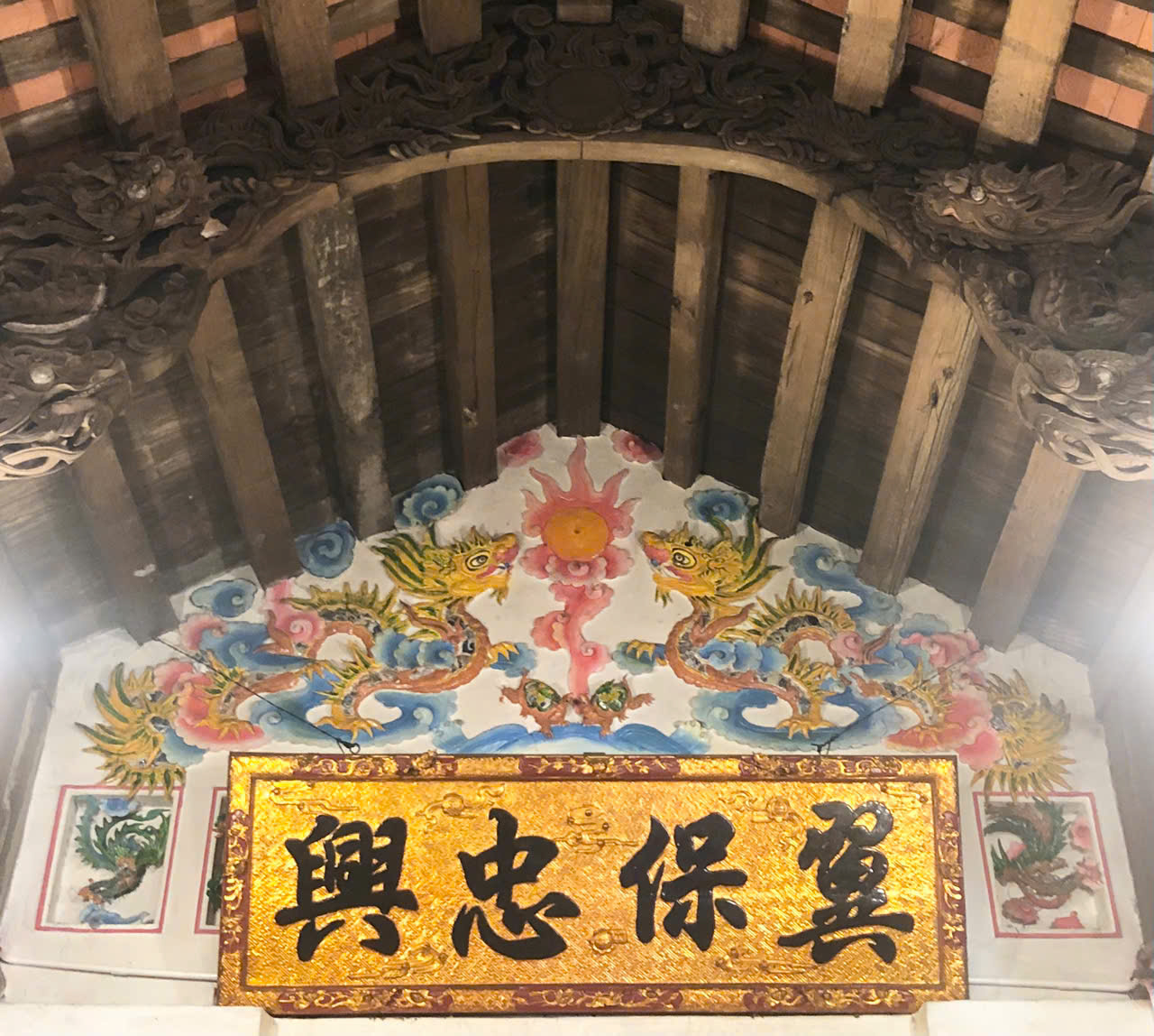 Trong hậu cung và gian nhà thờ, hoành phi, câu đối khắc họa tính linh thiêng và giá trị văn hóa: như “Dực Bảo Trung Hưng”, “Giang Sơn Tối Linh”, cùng những câu đối ca ngợi đức và sự bảo hộ của thần linh đối với dân làng.