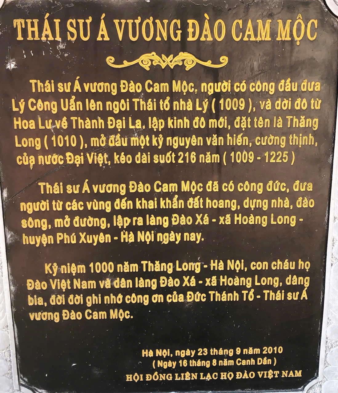 Thái sư Á Vương Đào Cam Mộc đã có công đức, đưa người từ các vùng đến khai khẩn đất hoang, dựng nhà, đào kênh, mở đường, lập ra làng Đào Xá – xã Hoàng Long – huyện Phú Xuyên – Hà Nội ngày nay.