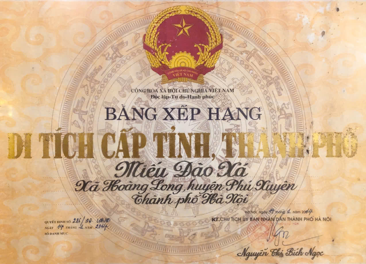 Với giá trị lịch sử lâu đời, ngày 14/1/2014, UBND thành phố Hà Nội đã ban hành Quyết định số 2702/QĐ‑UBND‑VX, công nhận Miếu Đào Xá là Di tích Lịch sử – Kiến trúc – Nghệ thuật. Công trình mang nhiều dấu ấn truyền thống: Miếu được xây dựng trong khoảng thời gian từ 1453 đến 1500 (thời nhà Mạc), hiện vẫn còn hai cây duối cổ có tuổi đời khoảng 500 năm, tương tự như dãy duối “buộc voi” nổi tiếng ở làng cổ Đường Lâm. Ngoài ra, trong miếu còn lưu giữ hai bản sắc phong cổ đã mòn, tấm bia đá cổ thời nhà Mạc (niên đại 1590), và một bảng gỗ chữ Hán – Nôm ghi thần tích và lịch sử xây dựng trong thời Mạc Mậu Hợp (1562–1592).