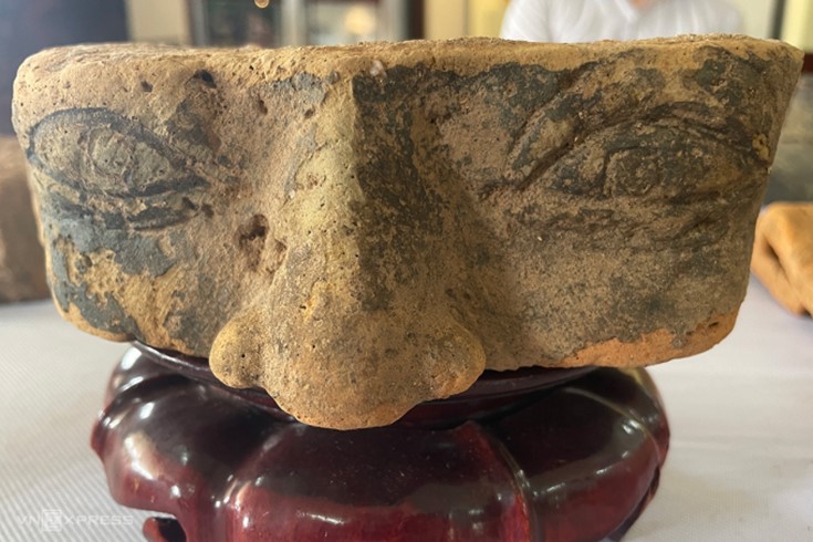 Gạch tạc hình mặt người được tìm thấy tại phế tích Phú Ân. Ảnh: Trần Hóa