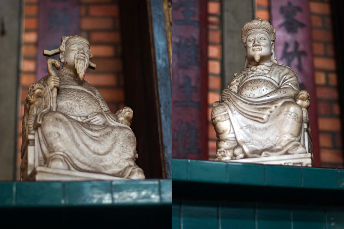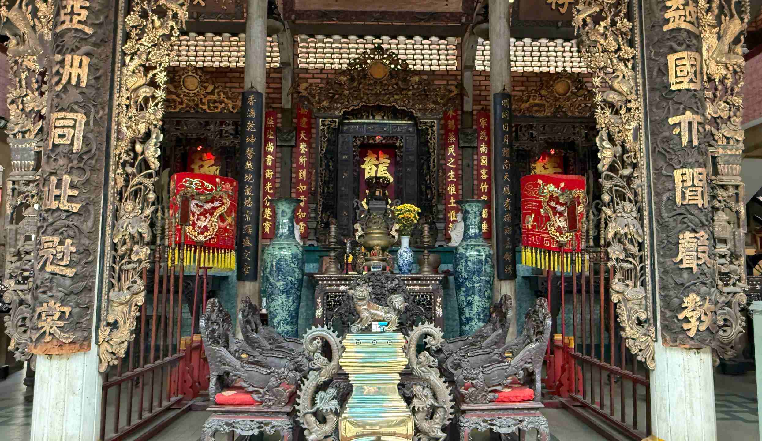 Phía trước khám thờ đặt tượng Trần Thượng Xuyên và Trịnh Hoài Đức, hai danh nhân có công khai phá vùng đất Nam Bộ. Các tượng được tạc bằng đá quý, thể hiện sự tôn kính và lòng tri ân sâu sắc của cộng đồng Minh Hương.
