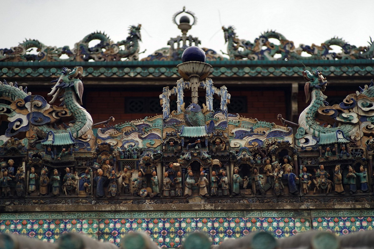 Chi tiết phù điêu “lưỡng long tranh châu” bằng gốm màu trên bờ nóc đình.