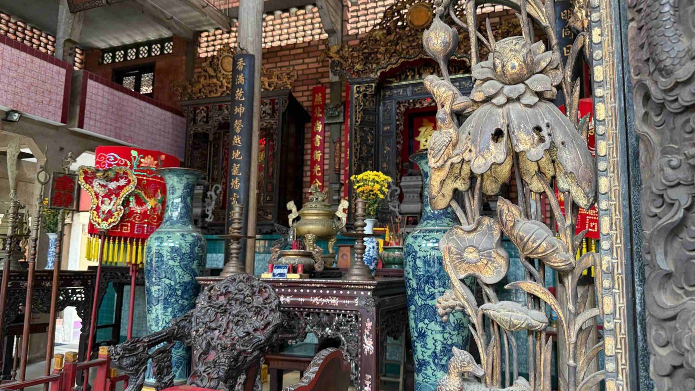 Ba bàn thờ trong chính điện sơn son thiếp vàng, tôn nghiêm và rực rỡ