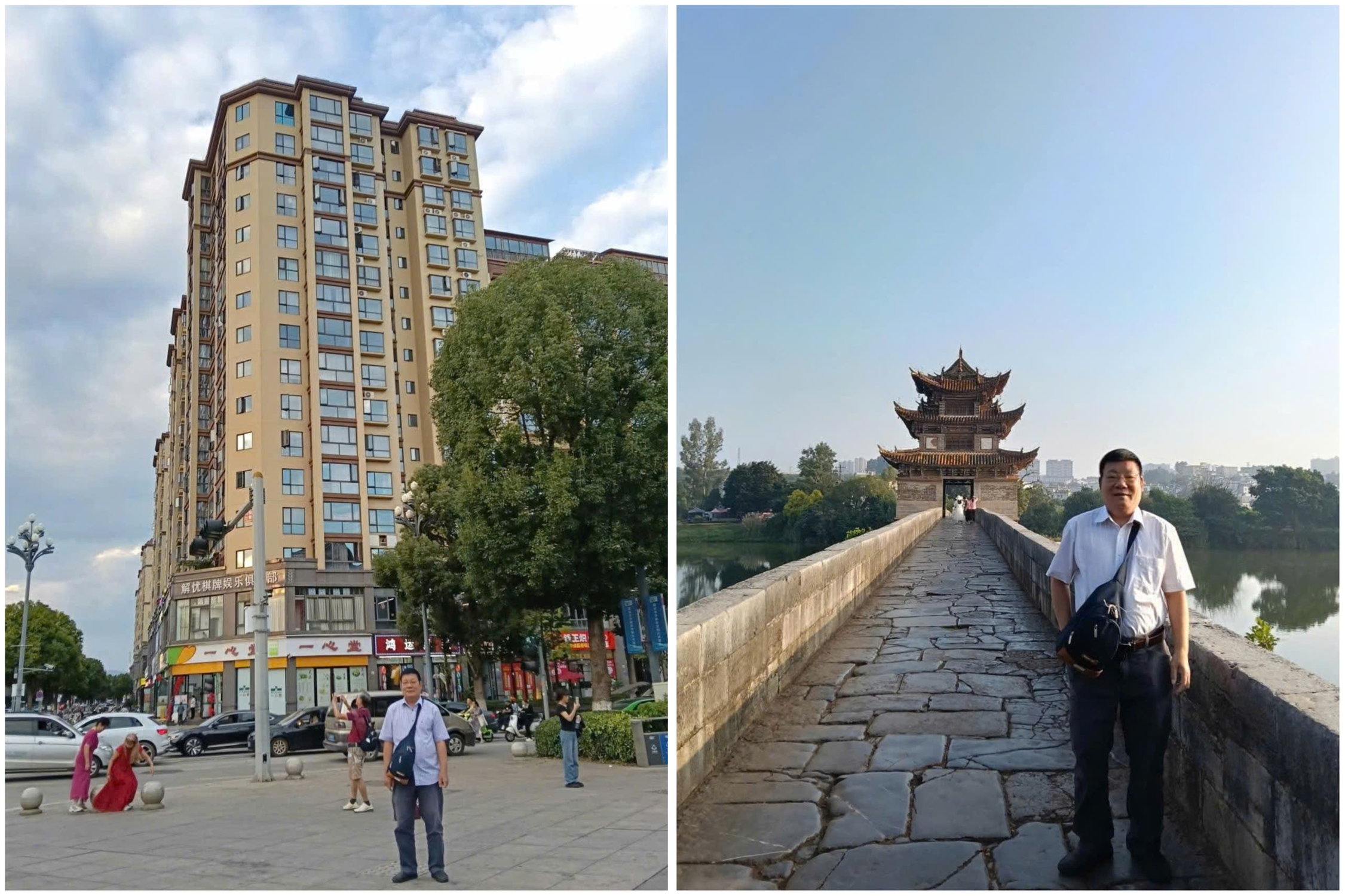 Tác giả chụp hình lưu niệm trước cổng Vương Phủ Môn, thành phố Di Lặc và trên cầu Song Long, thành phố Kiến Thủy.