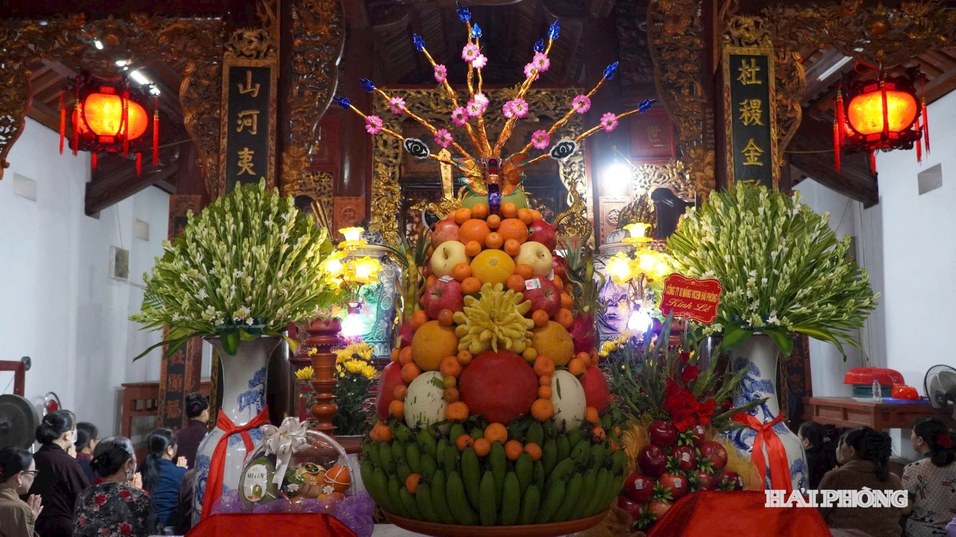 Mâm bồng bày ngũ quả trên ban thờ – nét trang trí quen thuộc trong không gian thờ tự truyền thống. (Ảnh: Báo Hải Phòng)