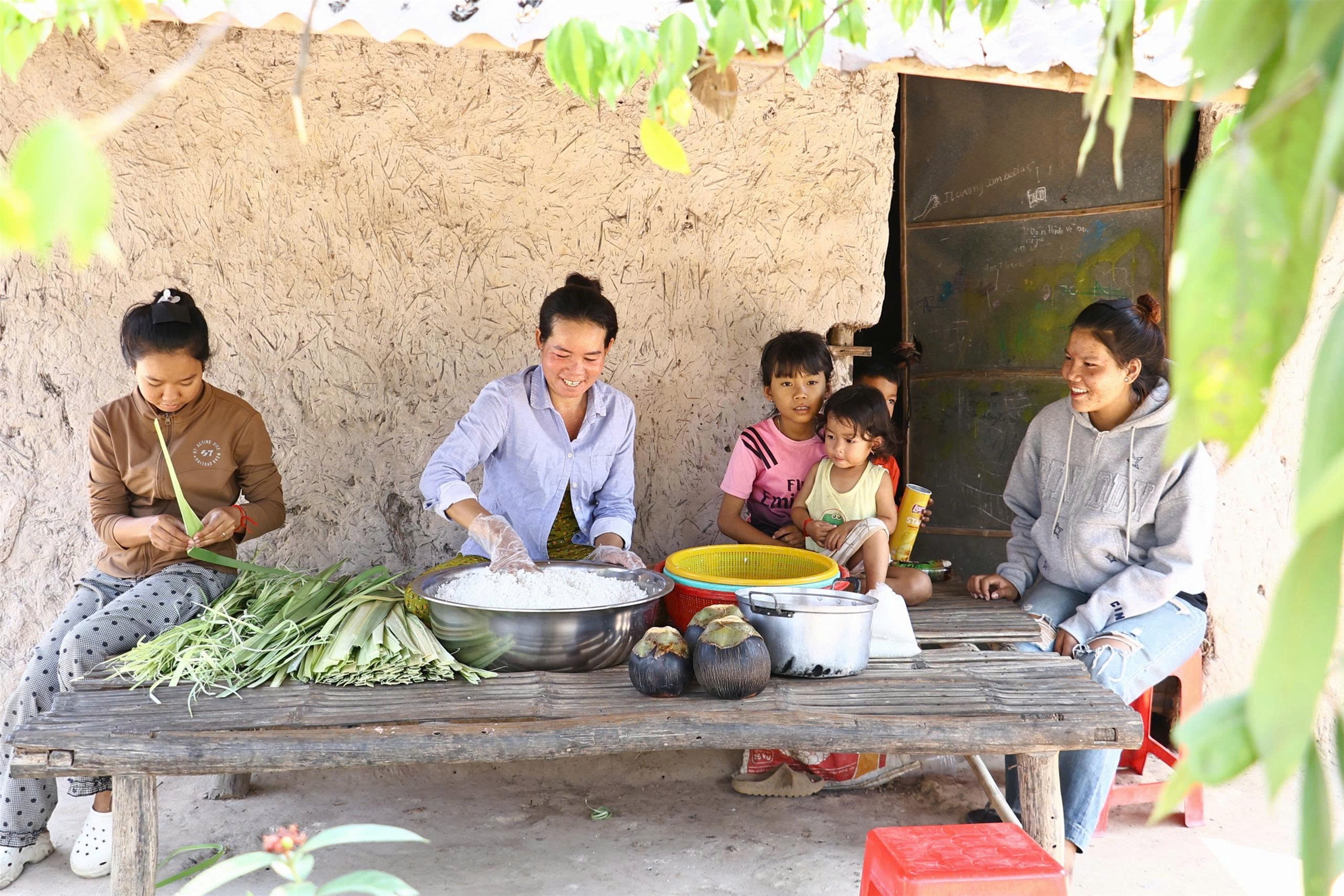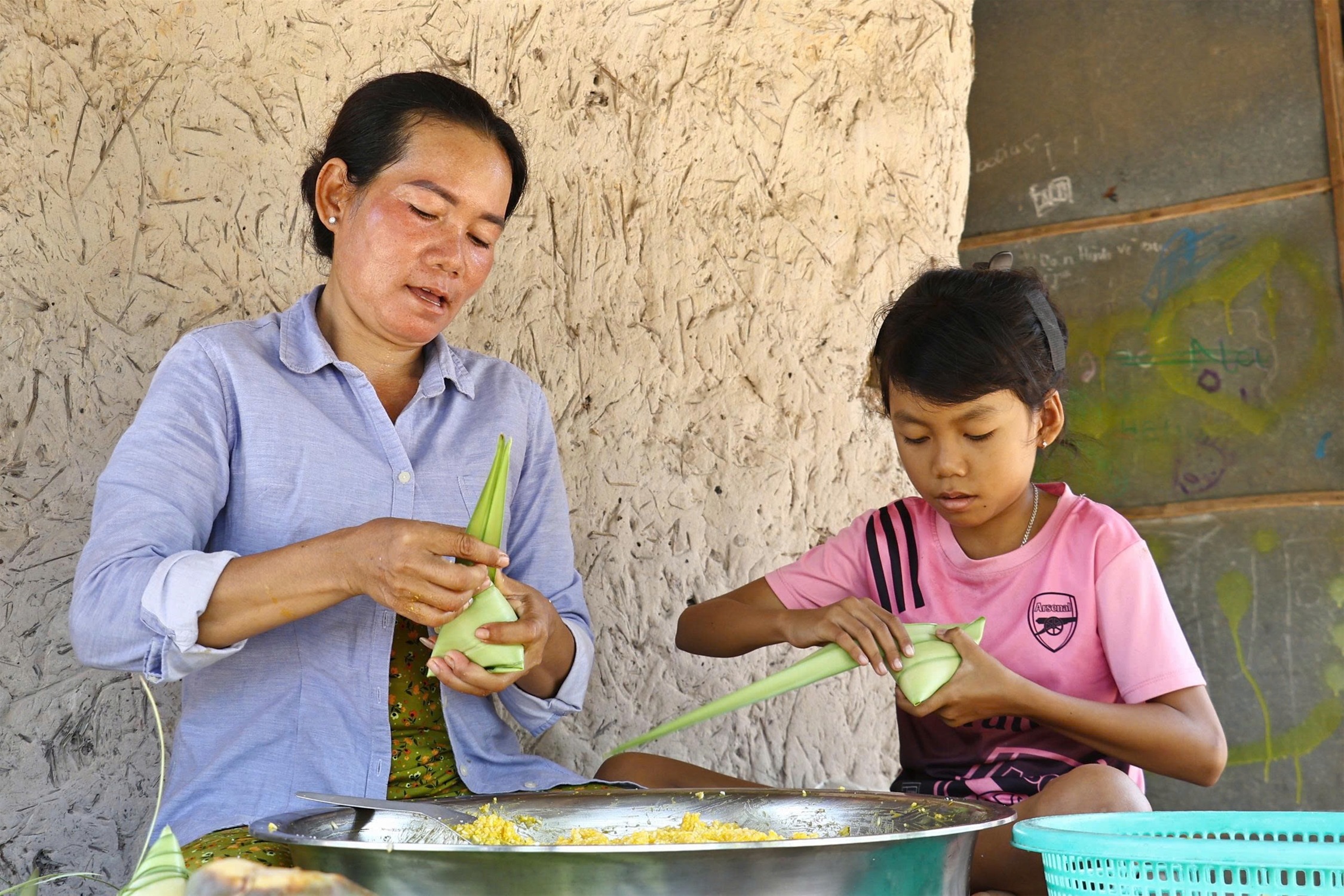 Đồng bào Khmer ấp Bến Cừ chuẩn bị gói bánh thốt nốt để dâng lễ dịp Tết Chol Chnam Thmay