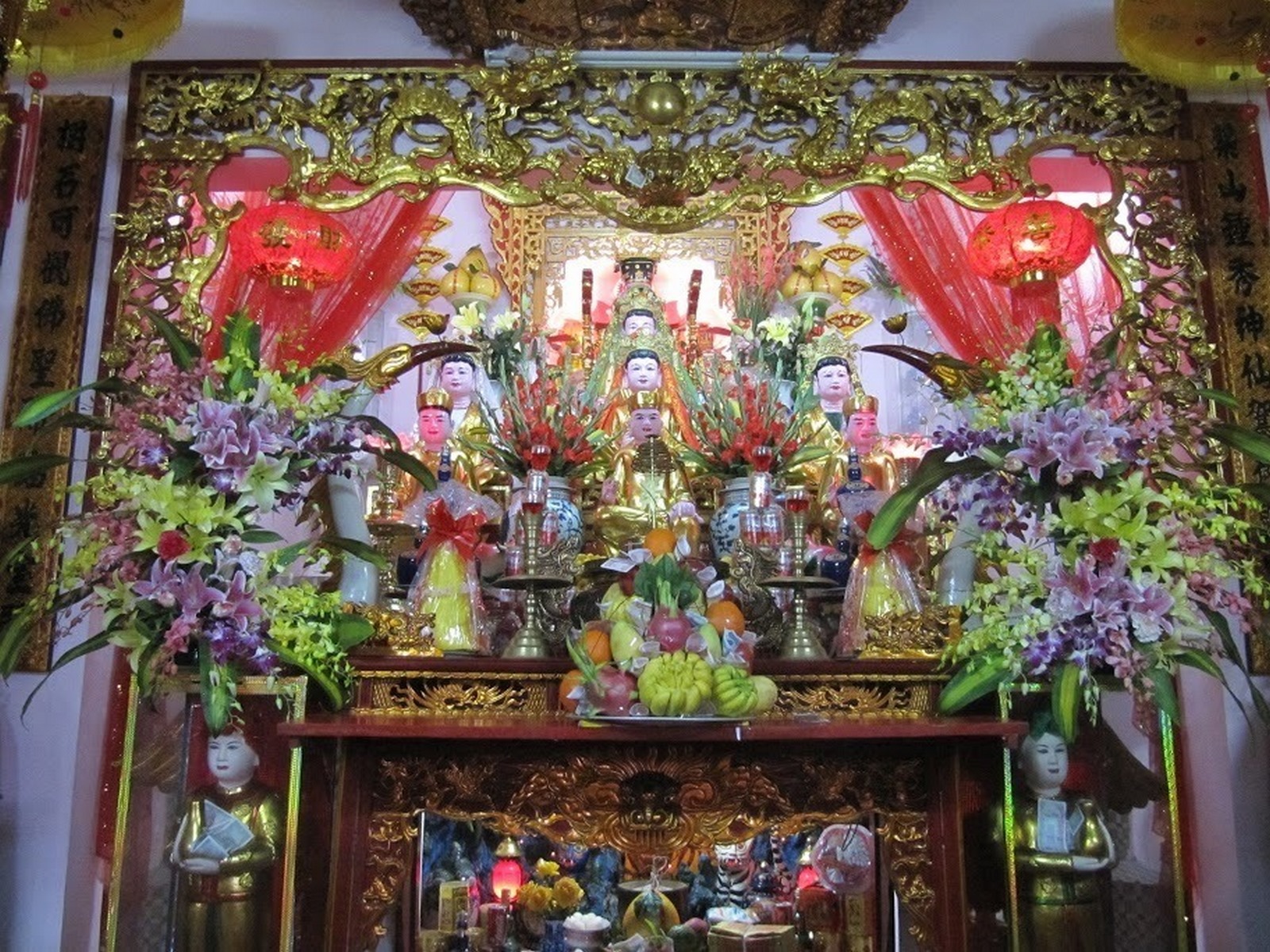 Trong các đền, phủ thờ Mẫu Tứ phủ, từ tranh tượng đến các đồ thờ cúng đều mang tính trang trí rõ rệt. Để nhận biết hơn cả là trang trí hai con rắn thần từ hai bên chầu vào điện thờ Mẫu, các cột cạnh điện thờ sơn son thếp vàng hình rồng uốn khúc, các họa tiết trang trí trên các điện, khảm thờ đều sơn son thếp vàng. Ngoài ra, còn có các dãy nón thờ treo trên trần mỗi điện thờ mà số lượng nón theo từng loại đều tương ứng với số lượng các vị Thánh theo từng hàng. Các đồ mã, những giấy tiền, vàng, hương không lúc nào vắng mặt trên các bàn thờ Mẫu. Rồi các động Sơn Trang mà ngôi đền nào cũng có với cảnh hang động, các vị Thánh Thượng Ngàn, các Tiên đồng Ngọc nữ… tạo nên sắc thái riêng cho phủ Thượng Ngàn này.