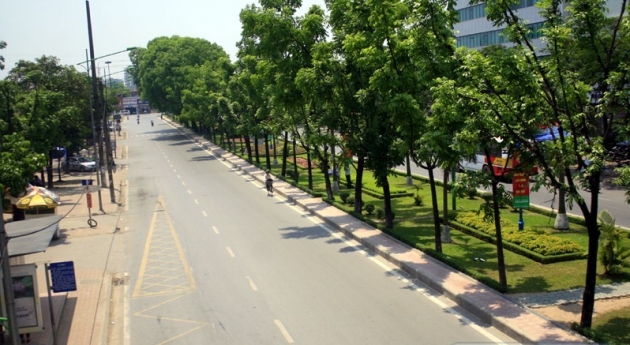 Dọc 2 bên vỉa hè, những cây bằng lăng cao bằng hai đầu người, đang mùa hoa nở khoe sắc tím. Hàng cây họ xà cừ thay cho dải phân cách giữa 2 làn đường, đang trong kỳ “sung sức” cứ vươn thẳng, vươn cao. Bằng lăng rủ bóng mát vỉa hè cho người đi bộ; tán cành lá họ xà cừ đủ để che chắn cho cả một rừng hoa, cây cảnh dài tít tắp. Cơ man nào là hoa, cây cảnh được trồng và được chăm sóc, cắt tỉa rất công phu qua bàn tay các anh, các chị nhân viên Công ty Cây xanh và Môi trường đô thị…