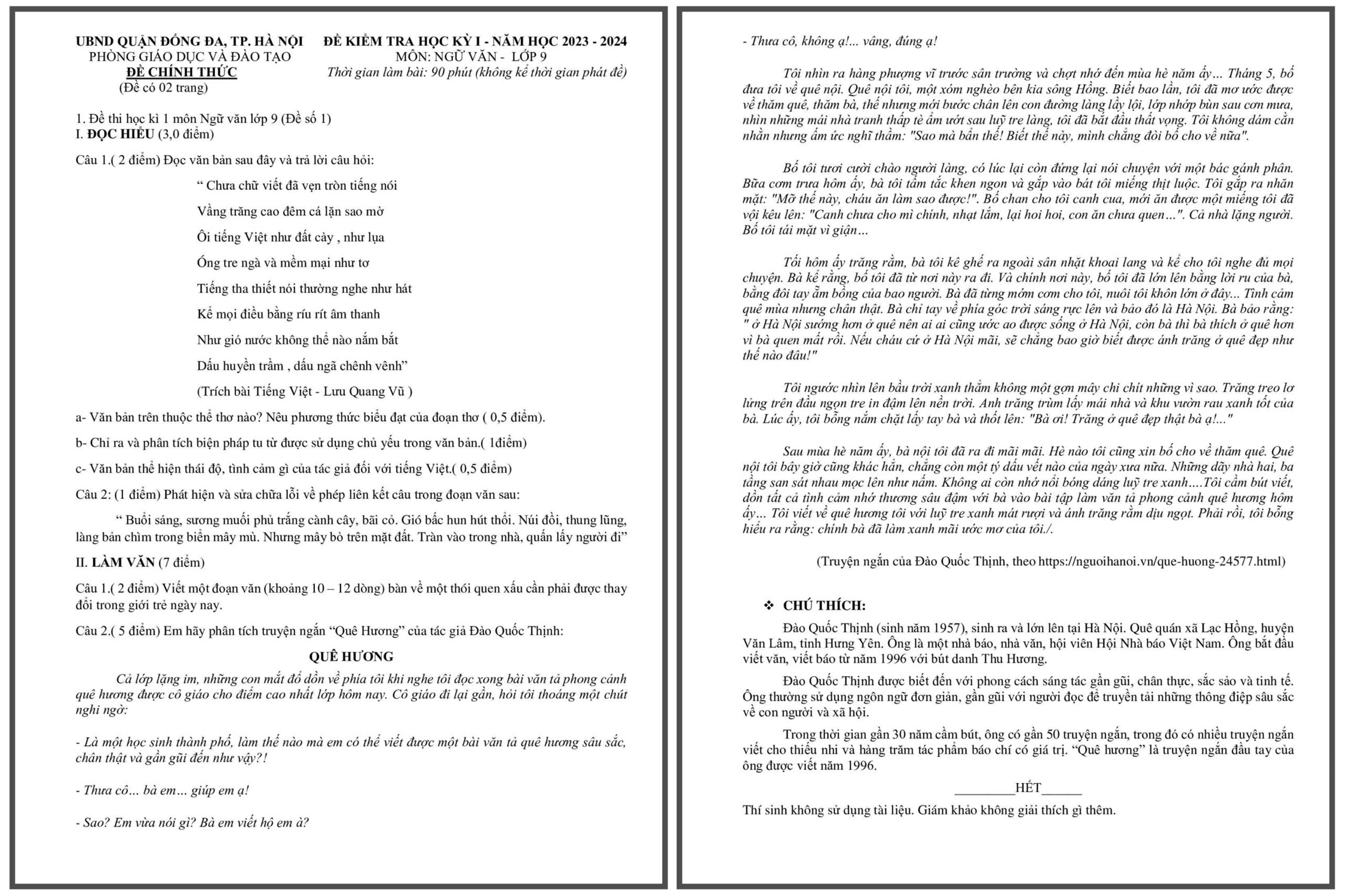 Đề thi học kỳ 1 môn Ngữ văn lớp 9: Em hãy phân tích truyện ngắn “Quê hương” của nhà văn Đào Quốc Thịnh?