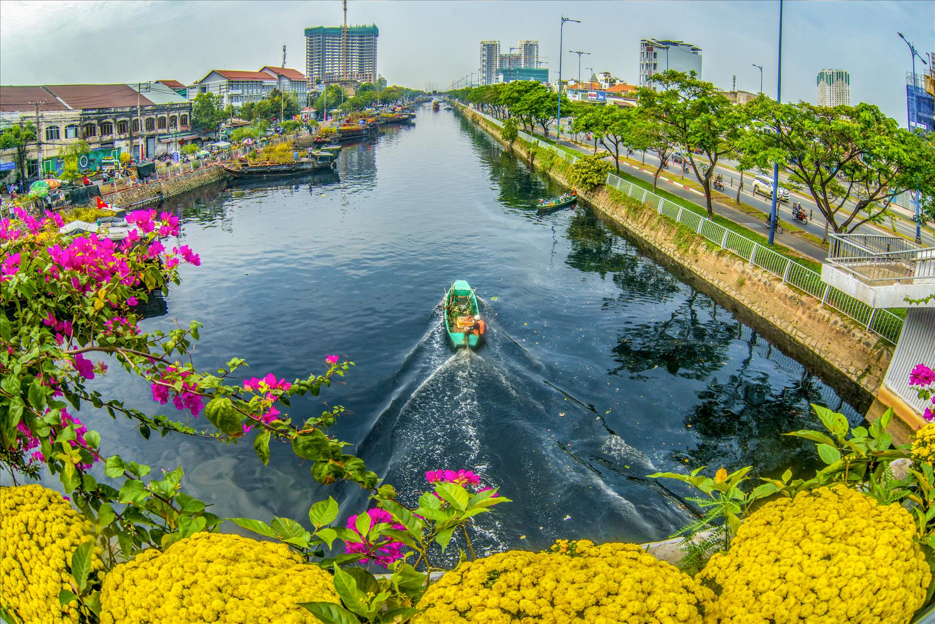 Ấn tượng nhất với tôi là chợ hoa xuân Bến Bình Đông. Hàng trăm ghe thuyền từ các tỉnh miền Tây chở đầy hoa, cây kiểng nối đuôi nhau cập bến. Khung cảnh “trên bến dưới thuyền” gợi lại nét sinh hoạt đặc trưng của vùng sông nước Nam Bộ, nay hiện diện giữa lòng đô thị hiện đại. Từ trên cao nhìn xuống, cả tuyến đường Bình Đông như được phủ kín bởi sắc vàng, sắc đỏ, sắc hồng của mùa xuân.