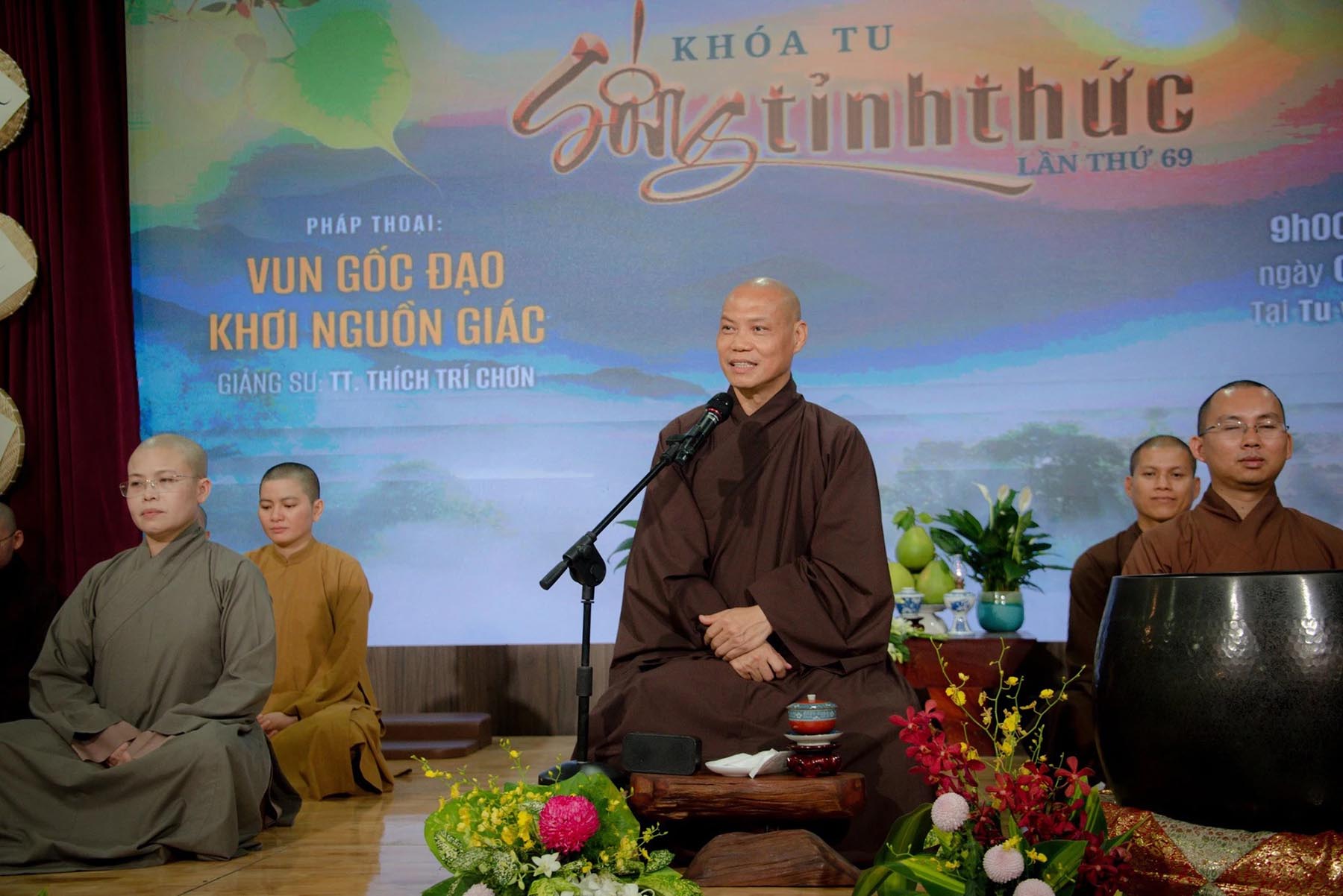 Theo Thượng tọa Thích Trí Chơn – viện chủ tu viện, toàn bộ công trình được thiết kế theo phong cách chùa cổ Việt Nam, thuộc Phật giáo Bắc Tông, hạn chế các họa tiết rồng, phượng hay trang trí sặc sỡ thường thấy ở nhiều chùa Nam Bộ. Chánh điện, mang tên “Phật đường tỉnh thức”, được xây dựng chủ yếu bằng gỗ, là nơi tụng kinh, tọa thiền của chư tăng và Phật tử. Mái ngói nâu trầm xếp lớp, kết hợp hệ thống đèn lồng và đèn lục giác, tạo nên vẻ đẹp trang nghiêm nhưng gần gũi.