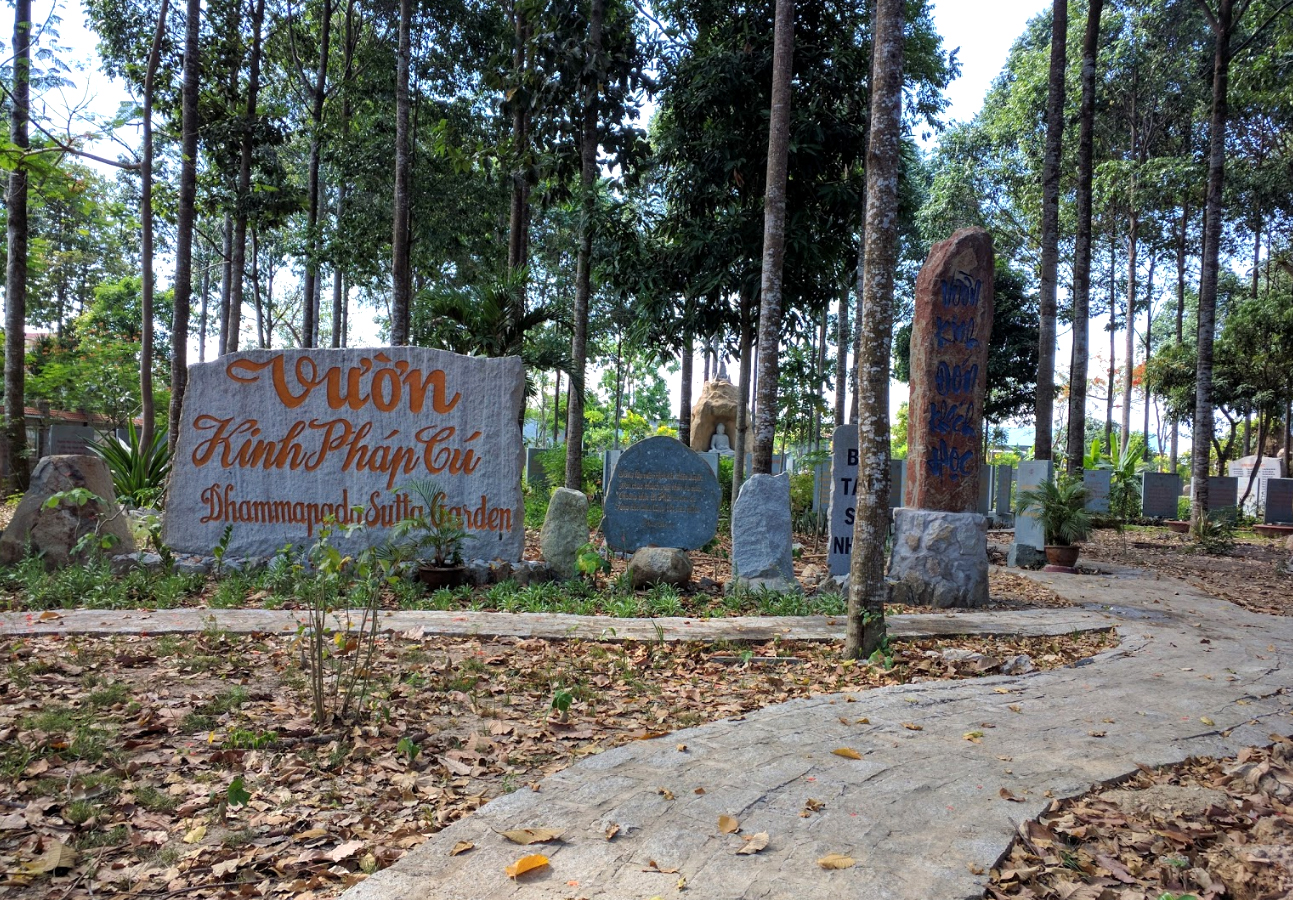 Sau nhiều thử nghiệm công phu về chất liệu đá, nội dung kinh, kiểu chữ và bố cục, thầy đã xây dựng thành công Vườn kinh Pháp Cú, một công trình tâm linh – mỹ thuật đầy ý nghĩa. Vườn gồm 213 phiến đá xanh (kích thước 0,4m × 0,6m), khắc 423 bài kệ của kinh Pháp Cú (dịch từ tiếng Pali sang Việt ngữ bởi cố Hòa thượng Thích Minh Châu), sắp xếp theo hình lá bồ đề tỏa ra tám hướng, tượng trưng cho Bát Chánh Đạo. Trung tâm vườn là mô hình núi có tượng Phật Thích Ca ngồi thiền.